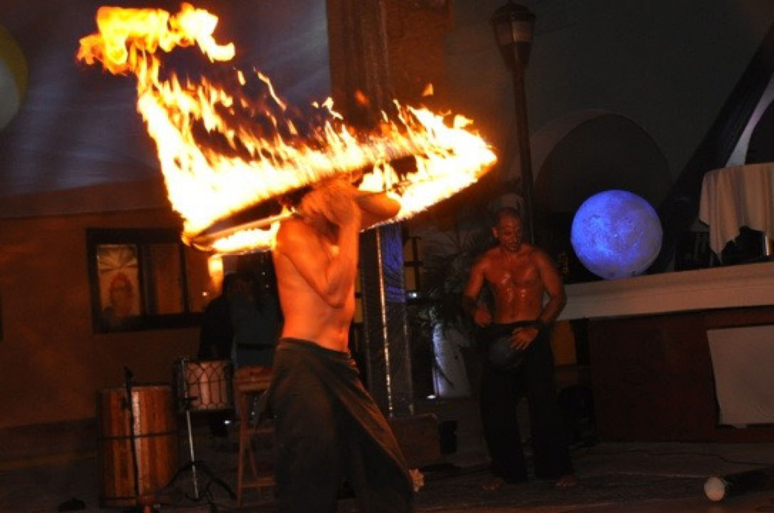 I går kveld var det party nede på stranden, med flammeshow og tilhørende trommer.