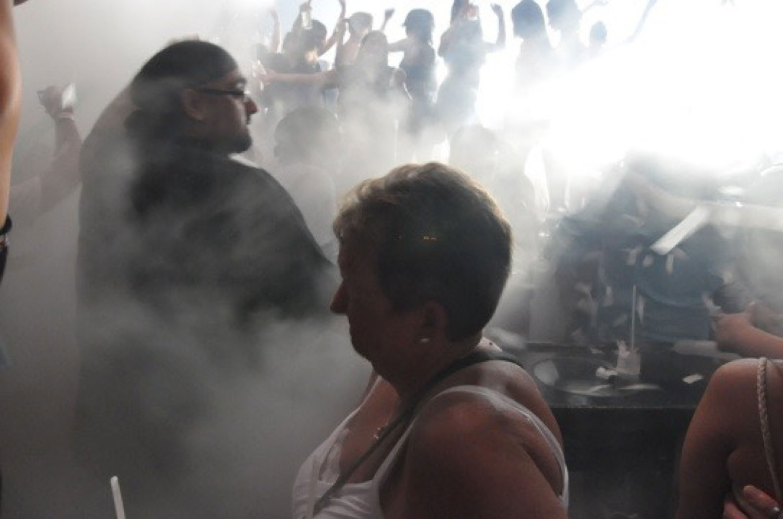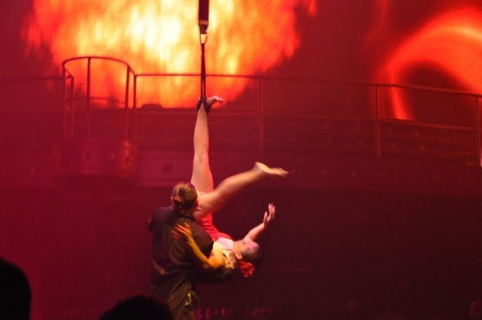Musikken var så høy at både vegg og gulv vibrerte i takt med musikken. Plutselig så kom det et hav av konfetti og noen artister dalende ned fra taket, det var også masse lysefekter i alle farger som blinket i takt med musikken.